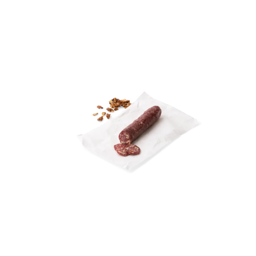 Het veluwnaartje is een gedroogde kalfsworst met stukjes walnoot.